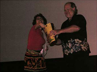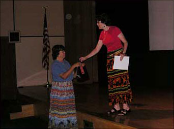 Karla awards one of the four Pre-Show Gene Autry Raffle winners with their prize.