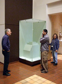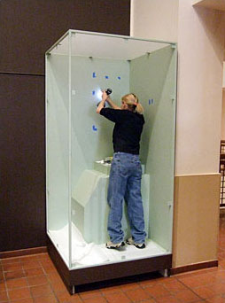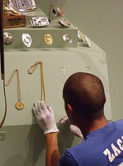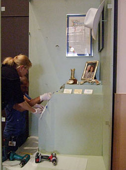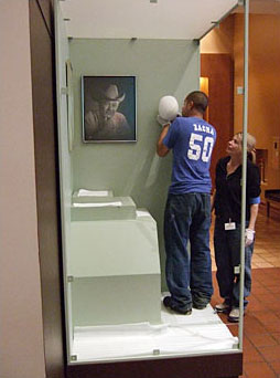 Exhibits Design team member Jorge Claustro sets up the custom made mount for Monte's hat.