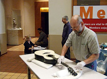 Monte's guitar receives special care and attention from Richard Moll, Chief Conservator for the Autry.