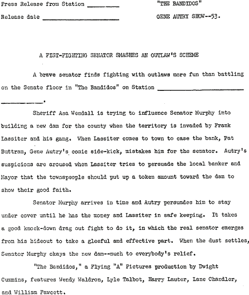 Sheriff Asa Wendall is trying to convince Senator Murphy to build a new dam for the county when the territory is invaded by Frank Lassiter and his gang. Pat Buttram mistakes Lassiter for Senator Murphy and sets him up in the town's best hotel suite. Lassiter convinces the local banker and Mayor that the people should put up a token amount toward the dam to show their good faith. While Lassiter puts on his act as the Senator, Gene Autry busily digs up clues, deliberately misleading Lassiter by asking him about a dead Congressman friend. The real Senator shows up and Gene has to keep him undercover until he has the money and Lassiter in safekeeping. It takes a good fight to do it, in which the real Senator takes a gleeful part. He also okays the new dam—much to the relief of the townspeople.
