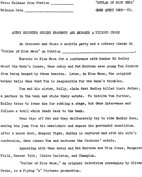 On the way to Blue Mesa, insurance investigators Gene Autry and Pat Buttram save young Tom Jackson from being hanged by three heavies. Tom gets away, and Gene and Pat ride into town to meet with banker Ed Hadley and his wife, Marie. Gene and Pat are investigating the bank's losses, which resulted from a series of stage robberies. They learn from the crippled Hadley that Tom Jackson is behind the trouble, so Pat gets a job as a cook at the café Tom runs with his sister, Sally. The Jacksons claim that Hadley killed their father, a partner in the bank, and stole their estate. Later, Tom overhears Idaho, the stage driver, telling Pat about the money he is carrying. Hoping to surprise the robber, Pat looks for Gene, who was knocked unconscious. Meanwhile, Tom has gone after the stage, but Gene, now revived, overtakes him and they surprise the heavies, who get away after a fight. Later they see the stage held up by the real outlaw, the Black Rider, who escapes, only leaving an empty suitcase. Gene figures out that his insurance company has been tricked into paying phony claims and trails the Black Rider back to the bank. Suspecting Hadley, he tips off Pat. They deliberately try to run down Hadley, making him jump from his wheelchair. After a knockdown drag-out fight, Hadley is captured, Marie confesses, and the estate is returned to the Jacksons.