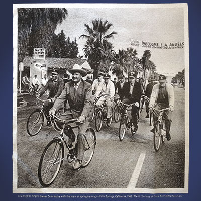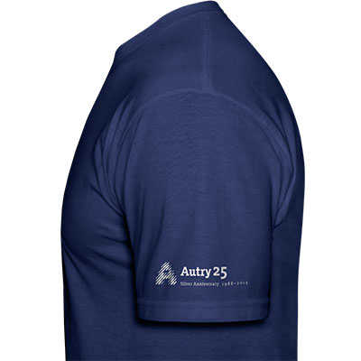 Gene Autry is known for riding his famous horse Champion, but in 1962 he swapped his saddle for a Schwinn and rode down the streets of Palm Springs with his baseball team, the Los Angeles Angels. This fun photo is now on a t-shirt, available exclusively at the Autry Museum Store. Photo is featured on the front with the museum's "Autry 25 Silver Anniversary" logo on the left sleeve.