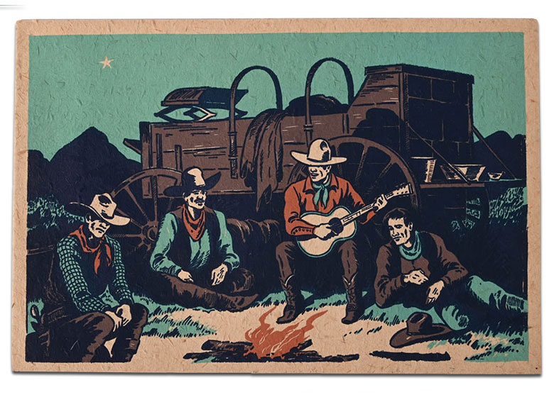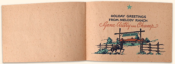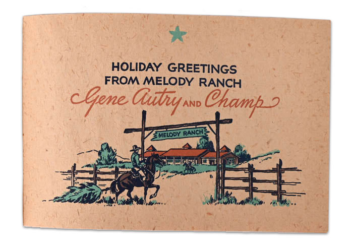 Throughout his entertainment career, Gene Autry commissioned original Christmas cards to send to friends and associates. This card, circa 1947, features an illustration of a campfire scene with Gene Autry playing his guitar while three cowboys sit nearby. The inside reads "HOLIDAY GREETINGS FROM MELODY RANCH Gene Autry and Champ" with an illustration of Gene Autry riding Champion while pulling a pine tree behind them as they enter Melody Ranch.