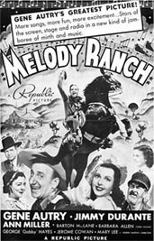 The Autry filmography includes at least one masterpiece: director Joseph Santley's "Melody Ranch" (1940), a Republic Pictures production that was both relatively lavish (the publicized budget was $500,000) and lengthy (84 minutes, at a time when many Autry features weren't much longer than an hour). The cast was top-notch, too, showcasing the comic relief of Jimmy Durante, George 'Gabby' Hayes and radio's "Vera Vague," Barbara Allen; "Park Avenue maverick" Ann Miller as a tap-dancing romantic interest; and such familiar character actors as Barton MacLane and Jerome Cowan.