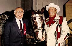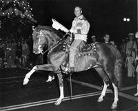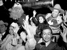 Gene Autry was already a popular radio star and movie icon when he recorded Here Comes Santa Claus (Right Down Santa Claus Lane) in 1947, a song which he co-wrote with Oakley Haldeman. The record launched Gene into yet another field of stardom, that of the role of the Christmas Cowboy. Gene’s affiliation with Old Saint Nick would lead him to record numerous Christmas songs including the chart-topping holiday hit, Rudolph, the Red-Nosed Reindeer. Gene also participated in the Hollywood Christmas Parade in 1945, 1946, 1947, and was the Grand Marshal of the parade in 1980. Gene and his wife Jackie Autry rode in the parade in the early 1980s.